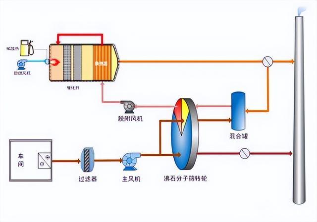 VOCs 的種類繁多、成分復(fù)雜、性質(zhì)各異,在很多情況下采用一種凈化技術(shù)往往難以達(dá)到治理要求,而且也不經(jīng)濟,在處理大風(fēng)量、低濃度的廢氣燃燒和回收的時候,如果沒有沸石轉(zhuǎn)輪,直接進(jìn)行燃燒的情況下,廢氣處理設(shè)備不僅體和龐大,而且產(chǎn)生的運行費用也會很龐大,因此,在有機廢氣治理中,采用兩種或多種凈化技術(shù)的組合工藝近年來得到了迅速發(fā)展,沸石轉(zhuǎn)輪吸附濃縮技術(shù)就是針對低濃度VOCs 的治理而發(fā)展起來的一種新技術(shù),與焚燒技術(shù)(催化燃燒或高溫焚燒)或冷凝技術(shù)進(jìn)行組合,形成了滿石轉(zhuǎn)輪吸附濃縮+焚境技術(shù)”和“沸石轉(zhuǎn)輪吸附濃縮+冷凝回收技術(shù)”。沸石轉(zhuǎn)輪是將大風(fēng)量、低濃度的廢氣濃縮到高濃度、小風(fēng)量的廢氣,從而減少設(shè)備的投入費用和運行成本,提高VOCs廢氣的高效率處理。利用不同單元治理技術(shù)的優(yōu)勢,采用組合治理工藝,不僅可以滿足排放要求,而且可以降低凈化設(shè)備的運行費用。